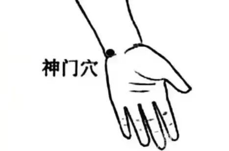 手腕内侧横纹处(神门穴):拇指按压3秒松开,重复10次。
