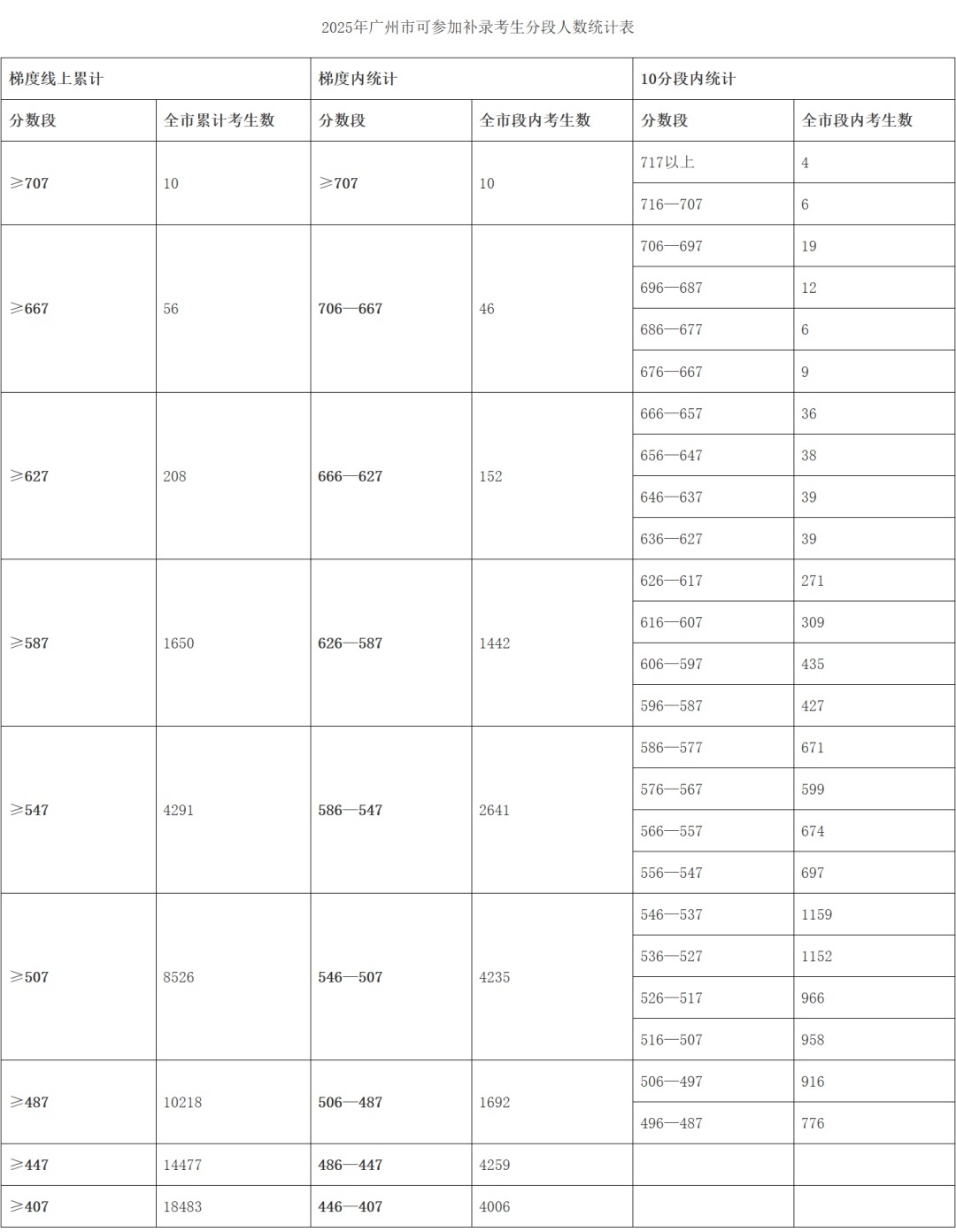 此外,广州市招考办还提供了可参加补录考生分数段人数统计表。考生和家长可结合该表与补录计划等实际情况,进行分析评估,合理填报补录志愿。
