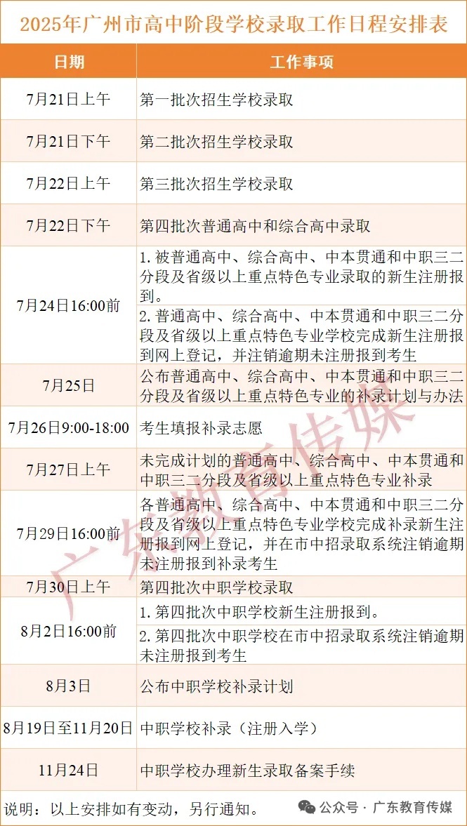 7月27日上午9:00至11:00,有补录计划的学校须登录广州市中招录取系统进行补录操作。